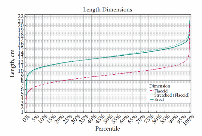 Conform analizelor acestei echipe, lungimea normală a penisului, atunci când nu se află în erecţie, este de 9,16 centimetri, iar circumferinţa de 9,31 centimetri. Un penis erect are, în mod normal, o lungime de 13,12 centimetri şi o circumferinţa de 11,66 centimetri.