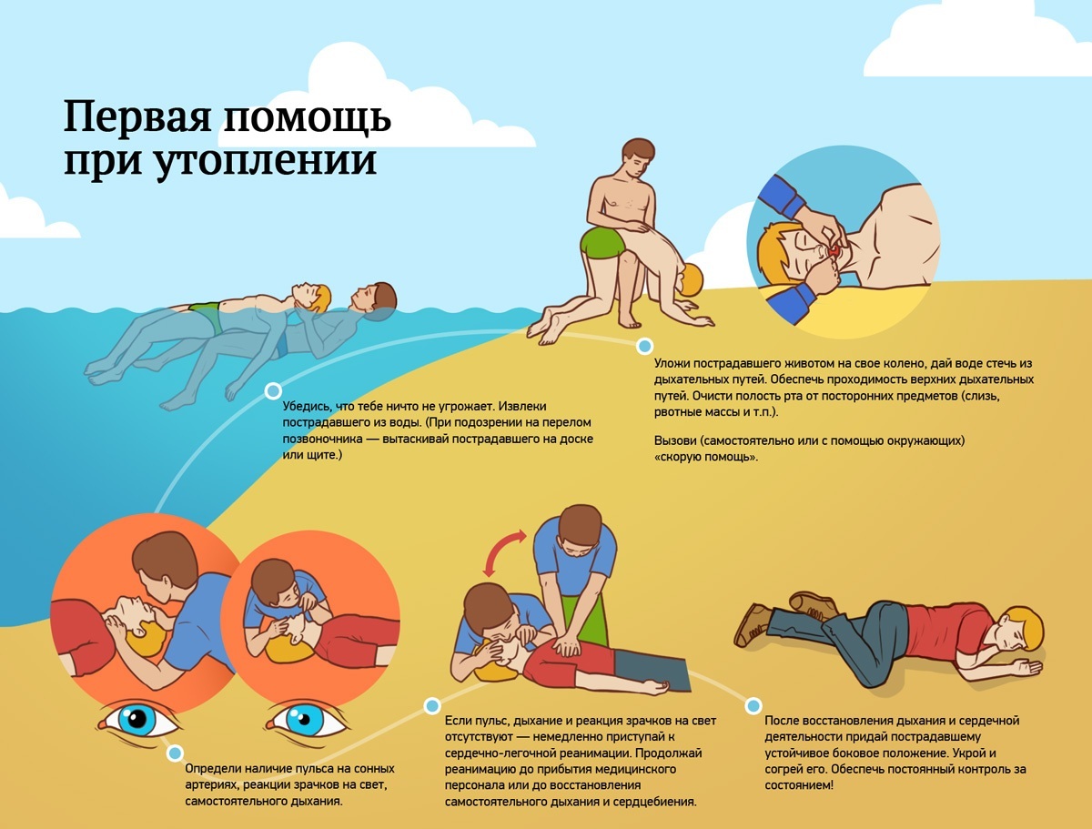 Если жертву вытащили из воды в бессознательном состоянии с остановкой дыхания, сердцебиения и с другими признаками клинической смерти, необходимо срочно действовать следующим образом:
